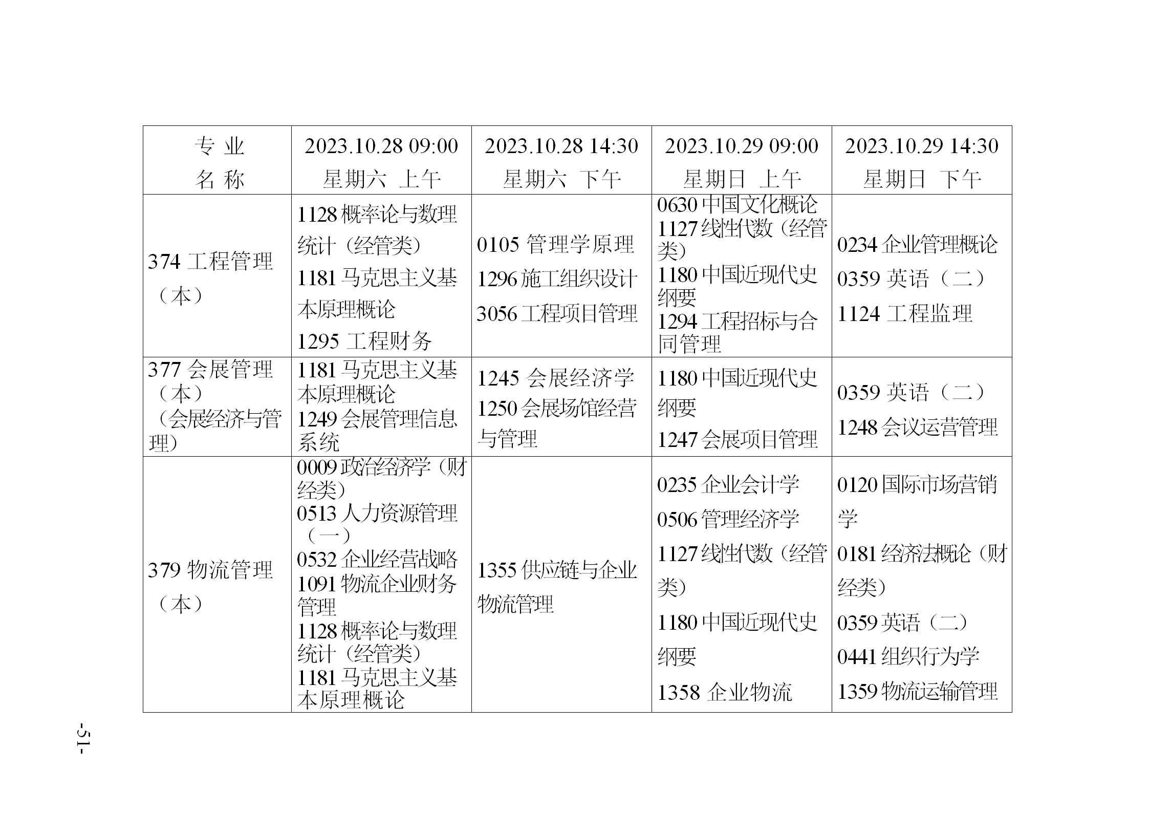 2023年10月天津自考课程考试时间安排表