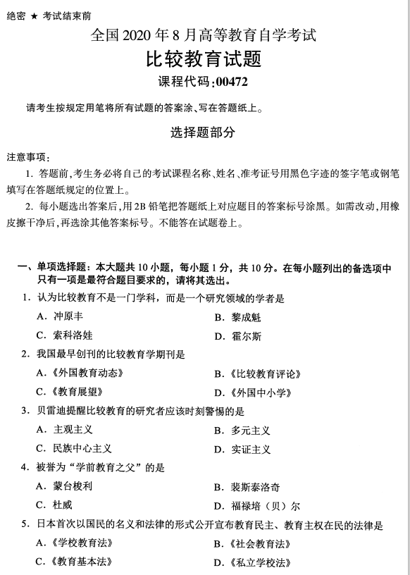 - 2024年4月天津自考00472比较教育试卷 05-10